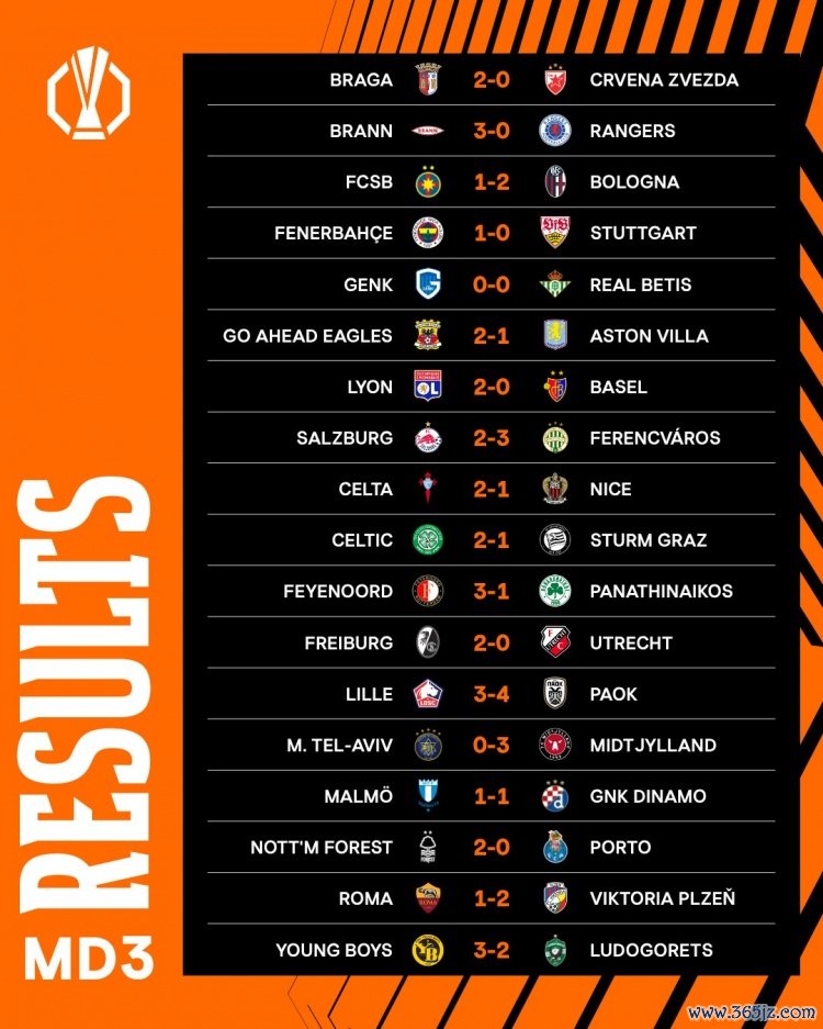 10月24日讯 欧联杯联赛阶段第三轮比赛战罢,诺丁汉丛林2-0波尔图,费内巴切1-0斯图加特,塞尔塔2-1尼斯,罗马、里尔、维拉落败。