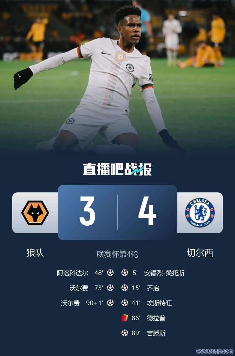 联赛杯第四轮,切尔西4-3险胜狼队,德拉普染红,桑托斯、乔治、埃斯特旺和吉滕斯破门。