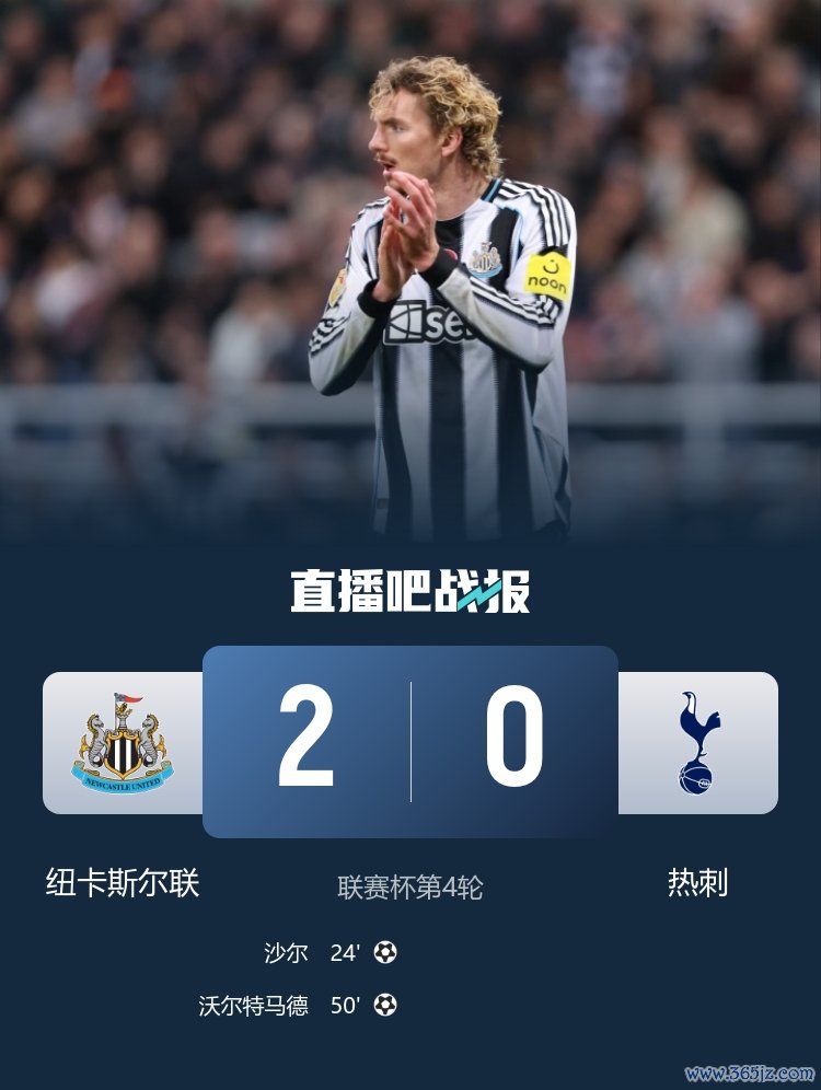联赛杯第四轮,纽卡2-0完胜热刺晋级,沙尔破门,沃尔特马德立功。