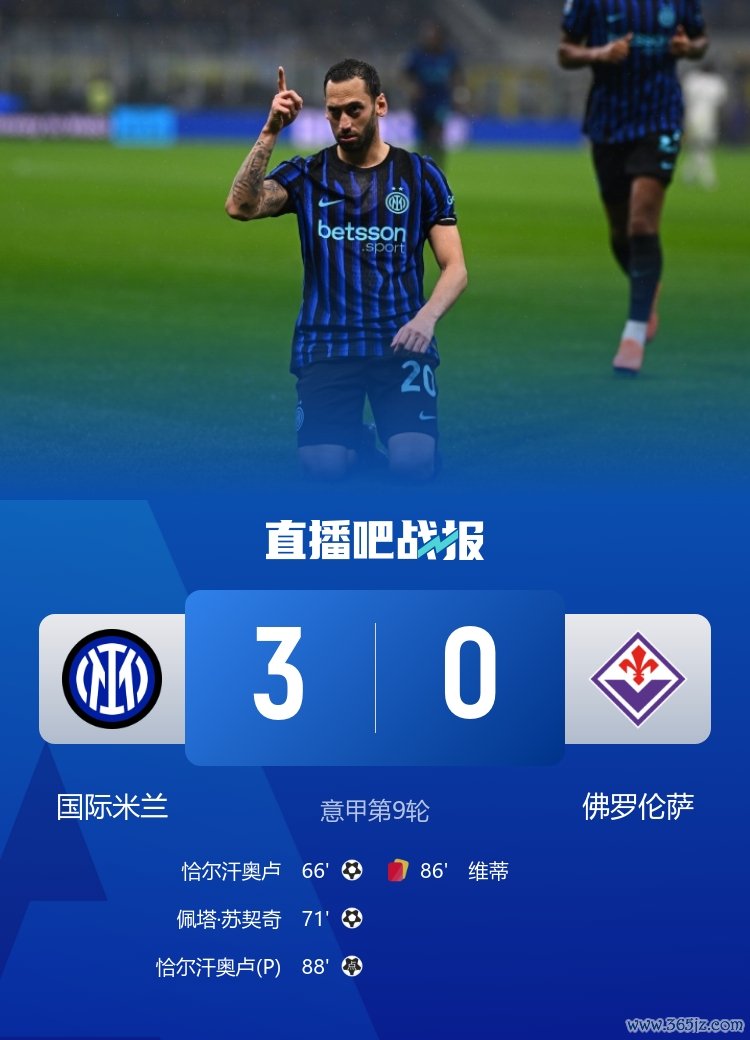 意甲-国米3-0佛罗伦萨 恰尔汗奥卢点射+双响苏契奇个东说念主秀立功