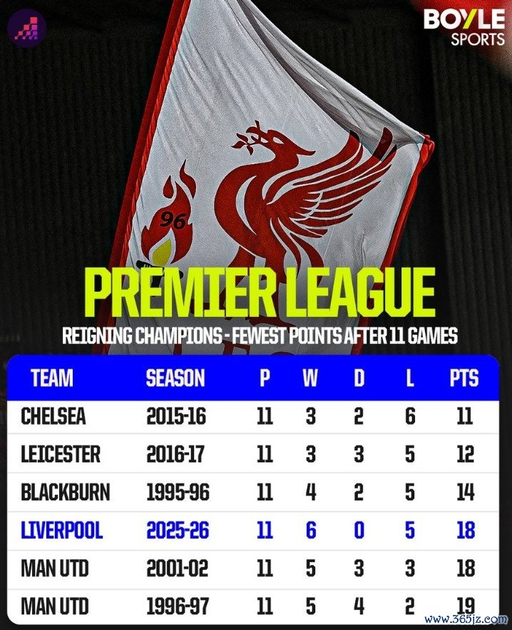 11月10日讯 在本轮英超,利物浦0-3不敌曼城,11轮事后只取得18分,OPTA也清点了英超历史卫冕冠军在前11轮事后最少积分情况,本赛季利物浦排在第四,具体如下: