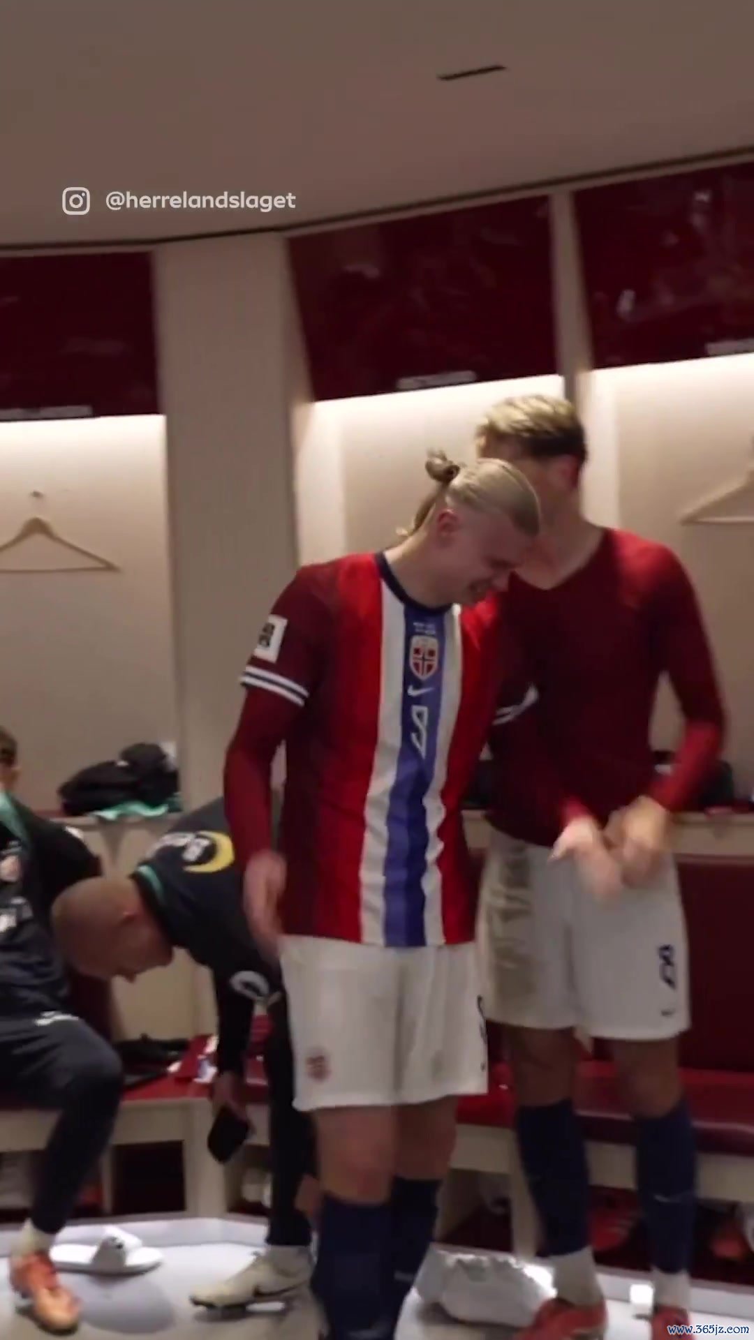 比赛铁心之后,哈兰德与队友在更衣室内翩翩起舞庆祝,现场氛围颠倒强烈。