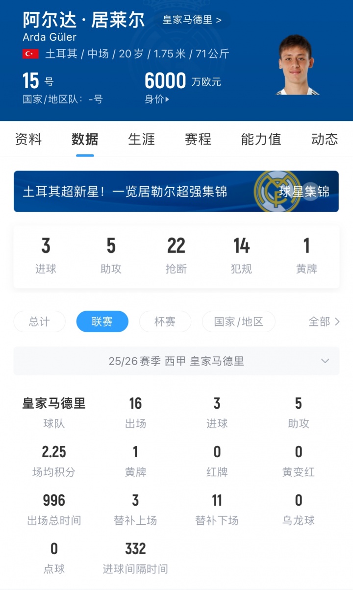 居莱尔现年20岁,他本赛季为皇马出战21场比赛,孝敬3球7助,现身价6000万欧。