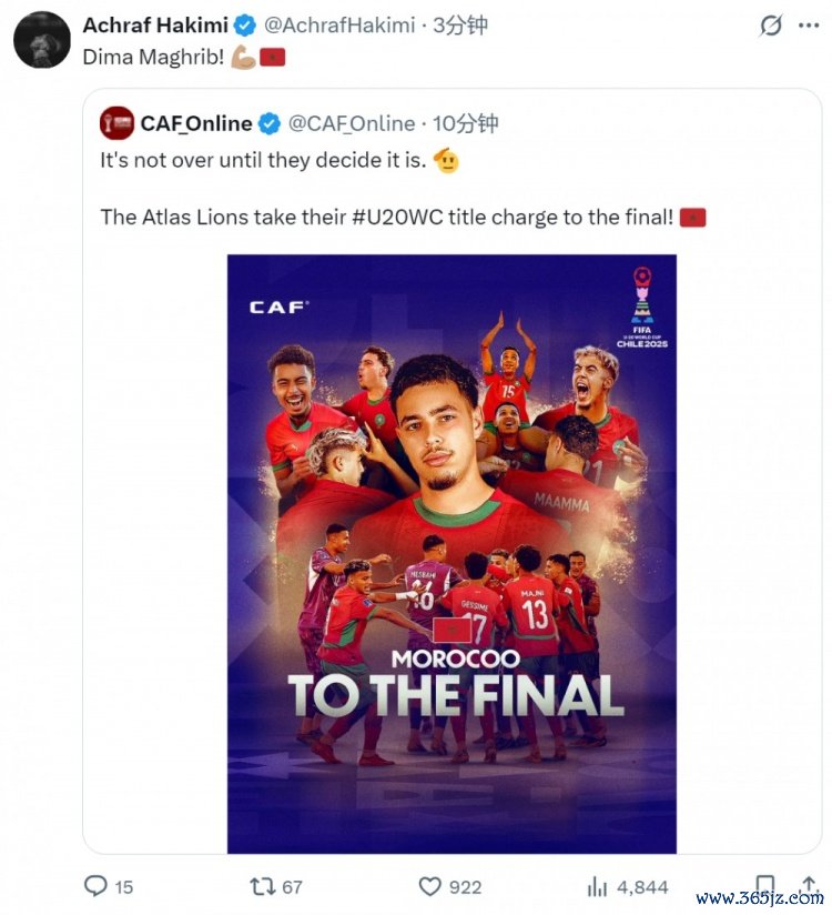 阿什拉夫更新社媒动态,转发摩洛哥晋级决赛的海报,配文:“摩洛哥加油!(恒久摩洛哥)”