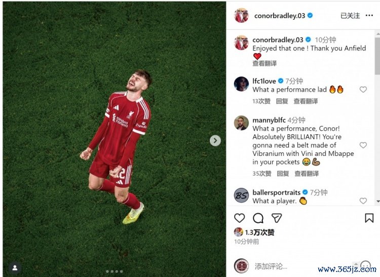 布拉德利当选本场比赛利物浦队内最好球员,赛后他在外交媒体上晒出相片,配文:“享受这场比赛,谢谢安菲尔德。”
