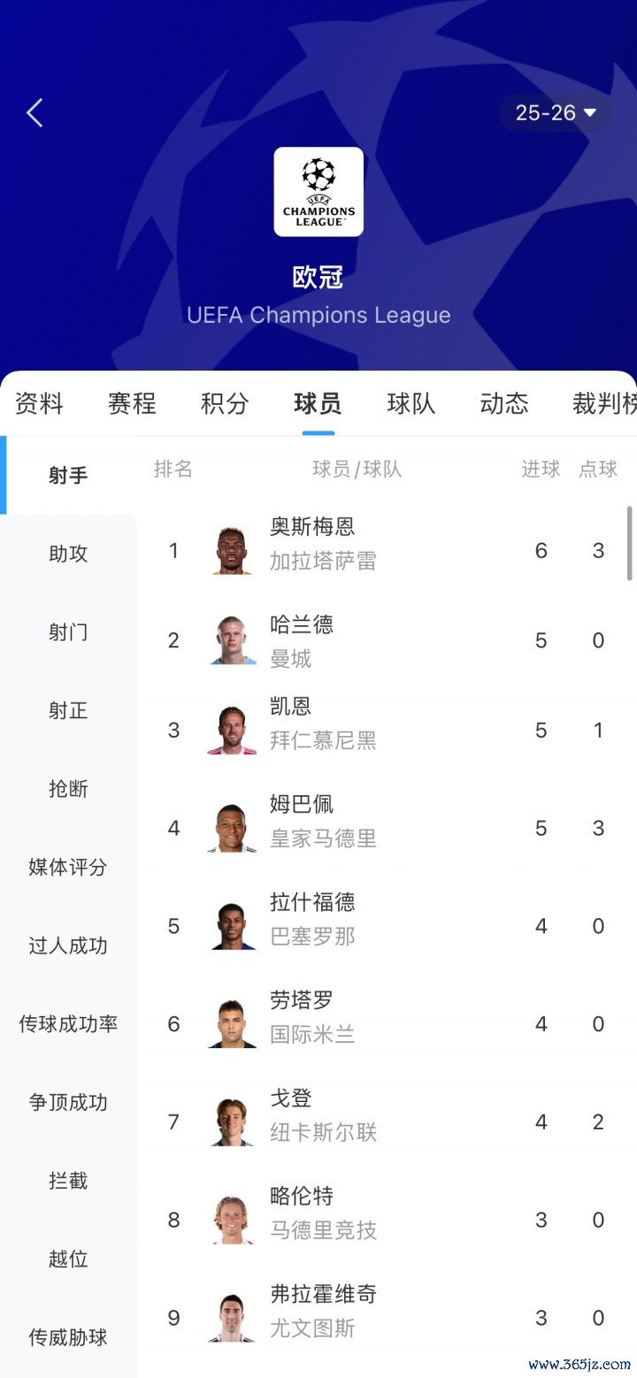 11月06日讯 欧冠联赛阶段4轮战罢,奥斯梅恩继上一轮梅开二度后,本轮又结束帽子戏法,4轮6球暂时登顶弓手榜榜首。