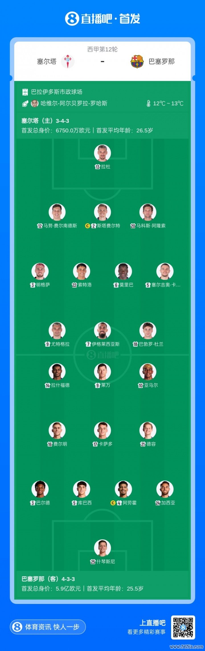 11月10日讯 北京技艺11月10日4:00,西甲第12轮,塞尔塔vs巴萨。赛前两边公布了本场比赛的首发名单。【巴萨方面,莱万本场归来首发,与亚马尔、拉什福德构成三叉戟。赛前巴萨作念出首发疗养,奥尔莫换下卡萨多。塞尔塔方面,明格萨、马科斯·阿隆索、莫里巴、尤特格拉均濒临旧主首发。】
