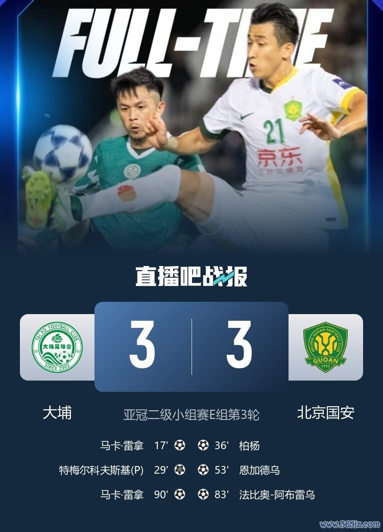 10月23日讯 亚冠二级小组赛E组第3轮,北京国安客场3-3战平大埔。