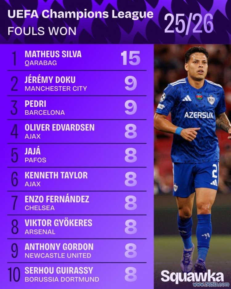 10月23日讯 本赛季欧冠联赛阶段已战罢3轮,Squawka统计了到现在收尾的被犯规榜单,卡拉巴赫后卫马修斯-席尔瓦15治安一,曼城边锋多库和巴萨中场佩德里均9次,分列二三位。