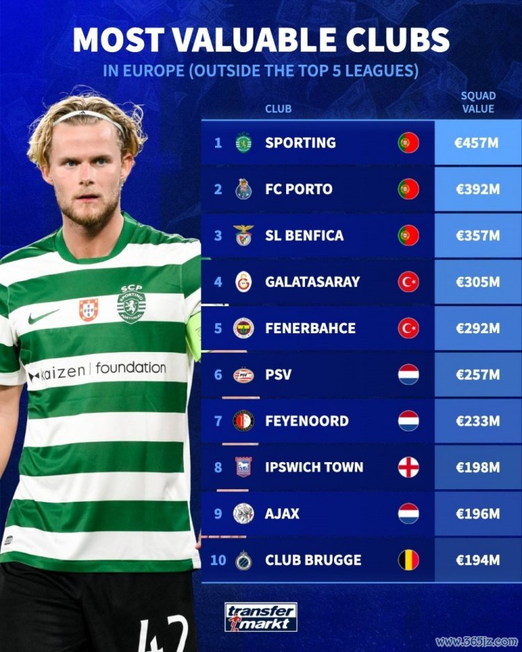 11月11日讯 德国转会市集统计了五大联赛以外欧洲俱乐部的身价,比肩出榜单,葡超三雄排行前三位。