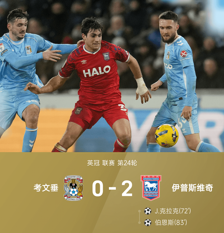 英冠战报:克拉克、伯恩斯破门,考文垂0-2伊普斯维奇