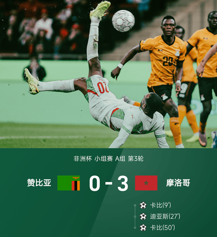非洲杯战报:卡比双响,迪亚斯立功,摩洛哥3-0赞比亚头名出线
