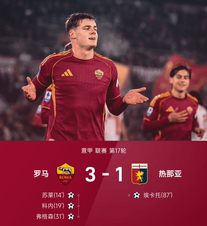 比赛进度王人备体现了两边的实力和情状差距,罗马从开场就紧紧掌持了主动权。凭借上半场苏莱、科内和弗格森在17分钟内联手打出的闪电三连击,罗马以3-1闲隙取胜。这场得胜不仅让罗马闭幕了近期联赛的残障,更让他们的积分达到33分,卓越尤文图斯,重新杀回联赛前四的欧冠区域。