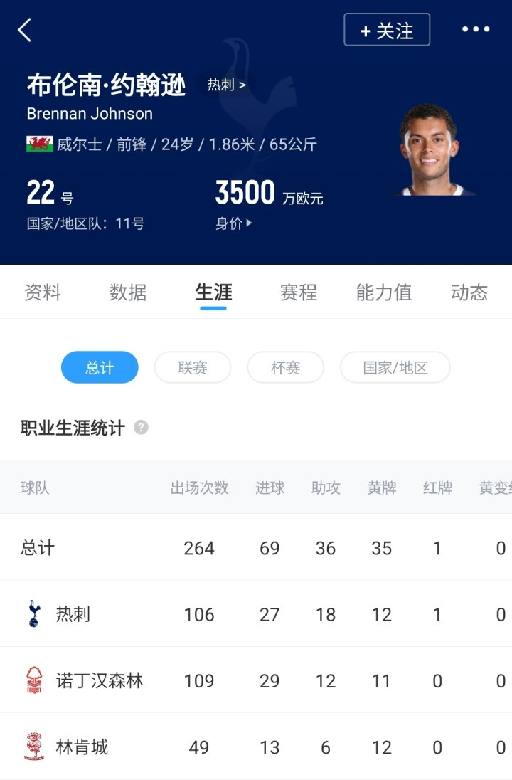 2023年夏窗,布伦南·约翰逊以5500万欧转会费从诺丁汉丛林加盟热刺,本赛季球员为热刺出战22场比赛,打进4球,德回身价3500万欧。