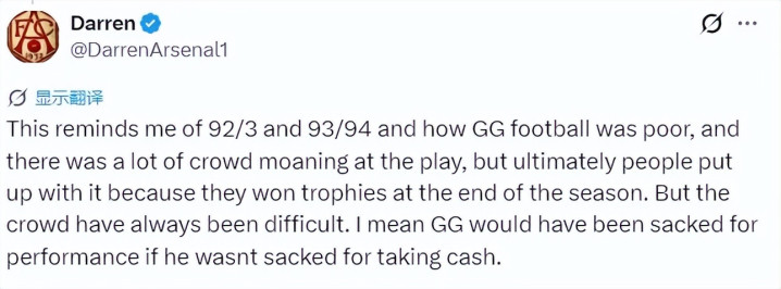 关于阿森纳目前射门风格在枪迷间引起的“文化之争”,此前阿森纳的小股东以及知名枪迷KOL,推主Darren表示:目前的情况让他想起了92-93以及93-94赛季,当时乔治-格拉汉姆的古代足球 非常丑陋。观赛人群 当时对赛事 有很多抱怨(所谓“闷蛋阿森纳”时期),但最终人们还是忍了,因为赛季末他们赢得了奖杯。但观赛人群 一直都很挑剔。当年乔治-格拉汉姆即便不是因为收受现金(球员转会中收好处费了)问题被解雇,也有可能因为球队糟糕的打法被炒鱿鱼。