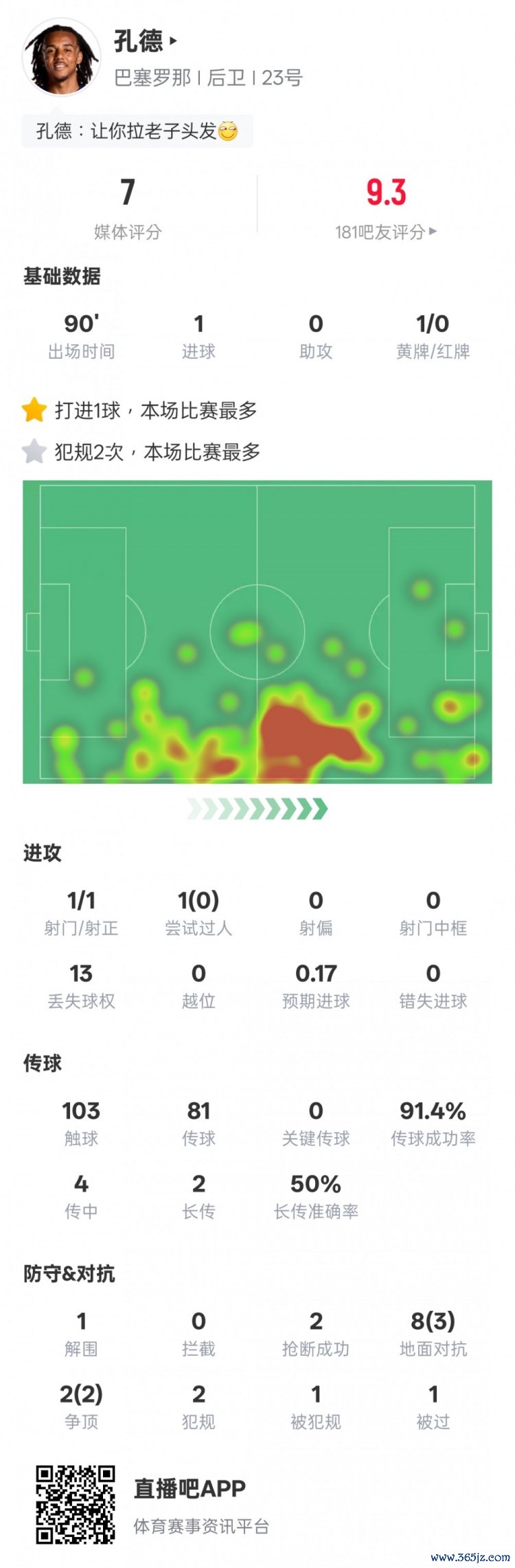 9月29日讯 2025-26赛季西甲联赛第7轮,巴萨2-1皇家社会,孔德首发出战,打进1粒进球,还有1次突围和2次抢断,2次争顶均得手,评分7.0。