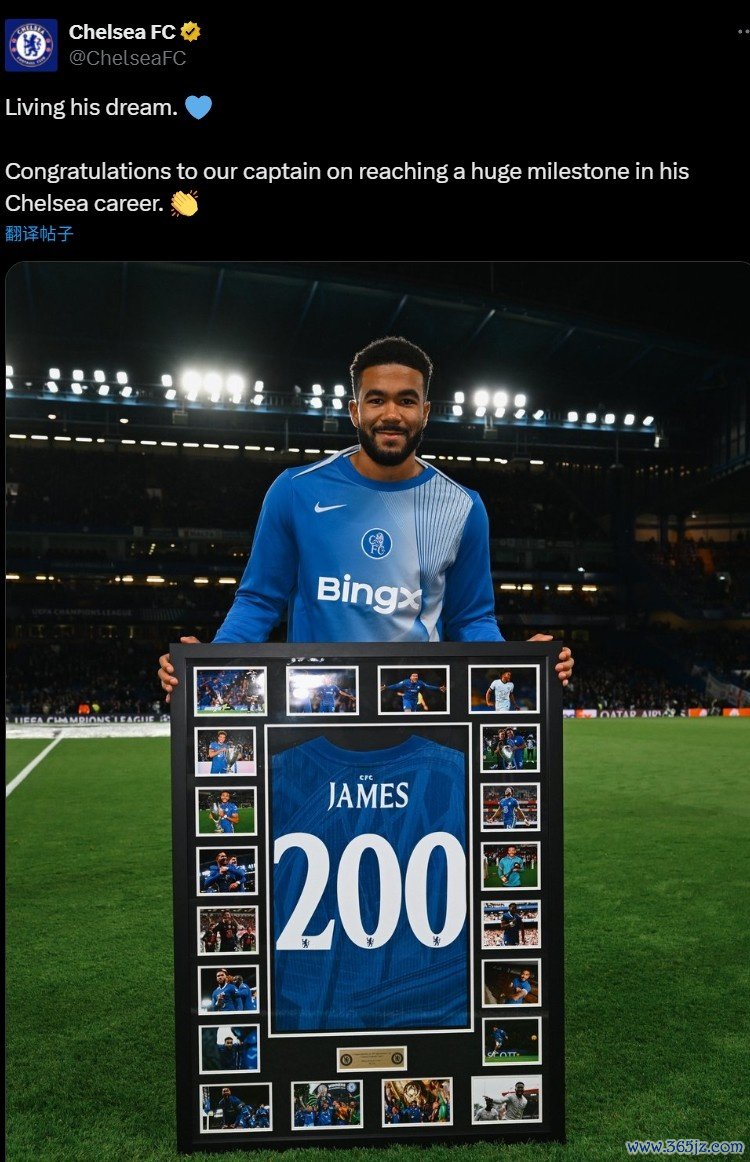 里斯-詹姆斯在本场比赛达成切尔西生计200场里程碑,他在赛前也展示了俱乐部为其施助的追念相框,主体为印有200字样的他本东说念主的球衣,邻近则是包括捧得世俱杯和欧冠在内的高光时辰。