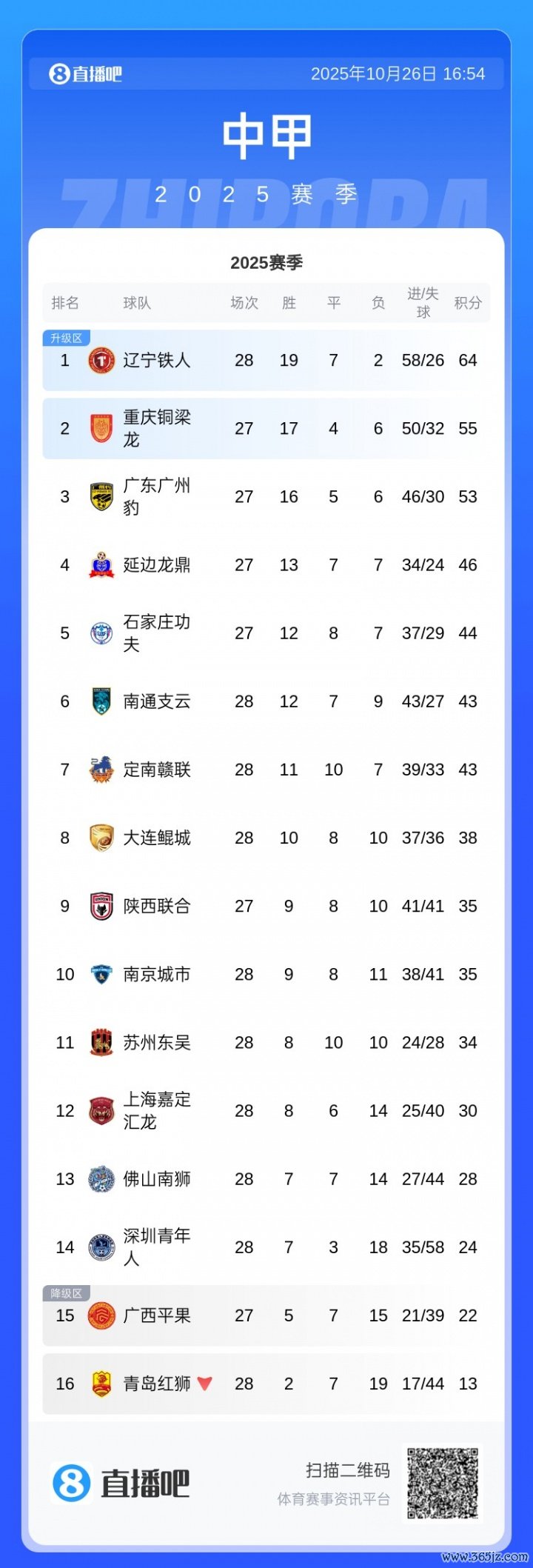 10月26日讯 中甲第28轮本周末打响,在刚刚甘休的一场比赛中,辽宁铁东说念主治服南通支云锁定本赛季中甲的一个升超限额,同期也锁定本赛季中甲冠军。