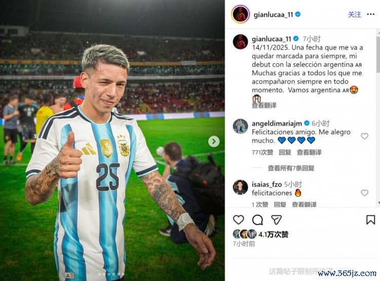 普雷斯蒂亚尼社媒晒出像片,庆祝完成阿根廷队首秀,配文:“2025年11月14日。这个日子将经久难忘在我心中,我代表阿根廷国度队完成首秀。赤忱感谢沿路以来支持我的所有东说念主,阿根廷加油!”