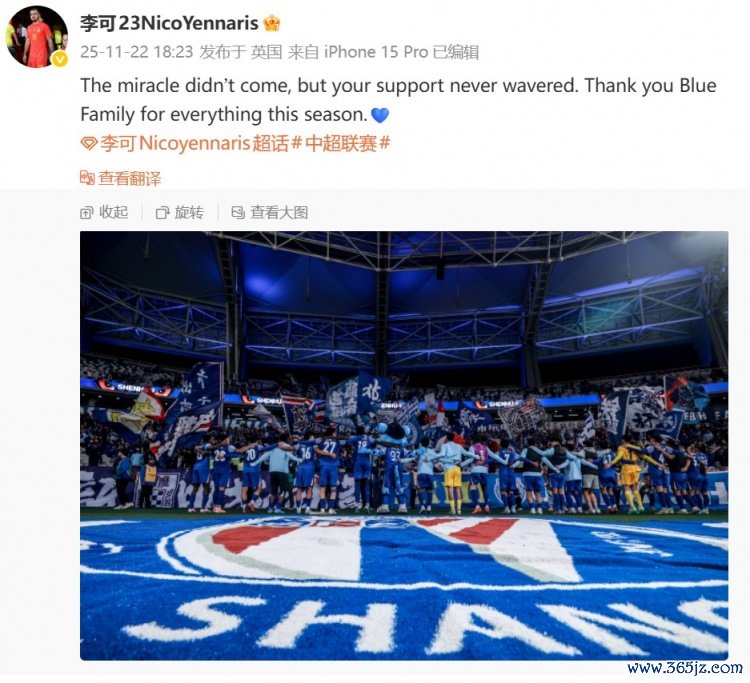 11月22日讯 本赛季中超收官之后,李克更新社媒,抒发未夺冠缺憾的同期,也感谢了球迷的支撑。
